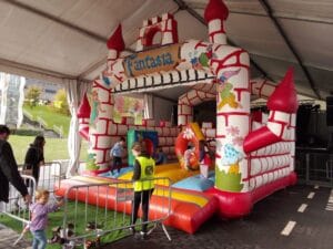 Un hinchable que es un castillo medieval con pivotes en las que golpean, pasan entre ellos, saltan…