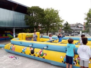 Bihurtu zaitez futbolin-jokalari egun batez! Puzgarri dibertigarri honetan, parte-hartzaileak barretara lotuta daude eta ezin dira askatasunez mugitu, alboetara bakarrik (mahai-futboleko panpinak bezala).